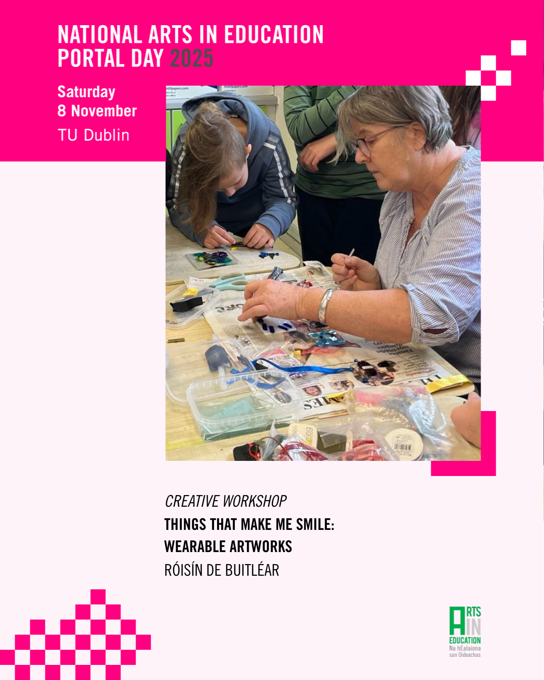 Artist, Educator and Curator Róisín de Buitléar leads a glassmaking workshop that explores ‘What makes you smile?’. Beginning with quick sketches and playful experiments, the group moves into cutting, layering and collaging recycled glass to create small wearable artworks. The atmosphere will be light and welcoming, encouraging everyone to join in. As pieces take shape, participants share stories and discoveries, finishing with a joyful ‘show and tell’ that celebrates imagination and connection.